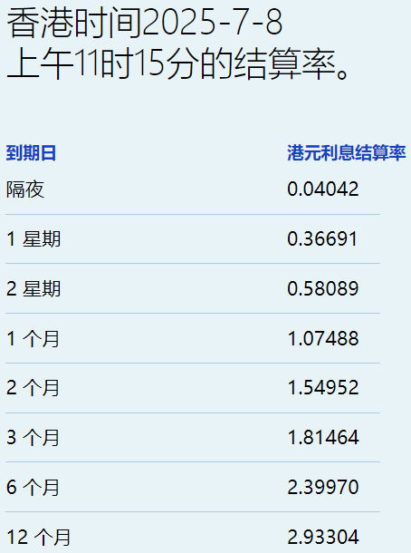 智通财经APP获悉,7月8日,港元拆息个别发展,而与楼按相关的一个月拆息报1.07488%,升2.042基点,连升三日,为5月19日后新高;反映银行资金成本的三个月拆息报1.81464%,跌0.024基点。