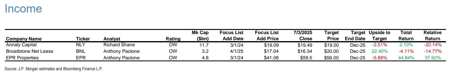 在收益型策略下,小摩分析师关注的美股包括:Annaly Capital Management(NLY.US)、Broadstone Net Lease(BNL.US)、EPR不动产(EPR.US),均为房地产信托投资公司。