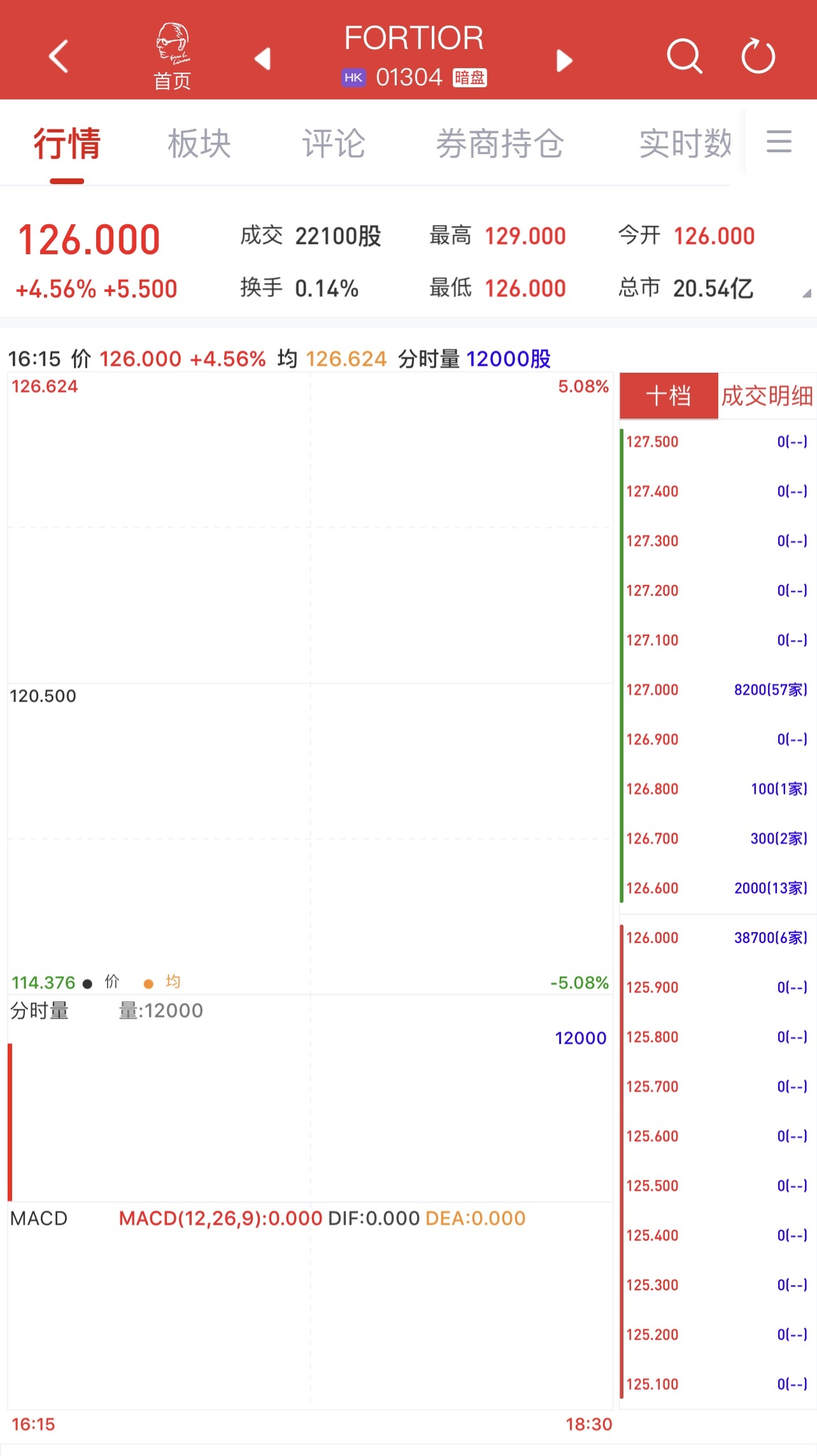 智通财经APP获悉,FORTIOR(01304)将于7月9日(星期三)在香港挂牌。截至发稿,利弗莫尔证券暗盘交易显示报价126港元,较招股价120.5港元上涨4.56%,每手100股,不计手续费,每手赚550港元。