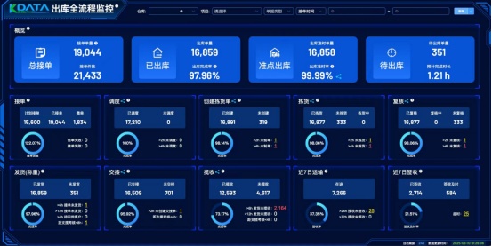 苏涛:升级后的KingKooData系统,核心在于强化过程管理。它实现了全链路可视化,清晰展示各环节状态,并将每个环节拆解,提供详细数据,即“一岗一屏”理念,真正实现了数据驱动业务流程的变革。如今走进仓库,大屏从制单、拣选、复核到发货交接,环环相扣,彻底改变了传统运营模式。