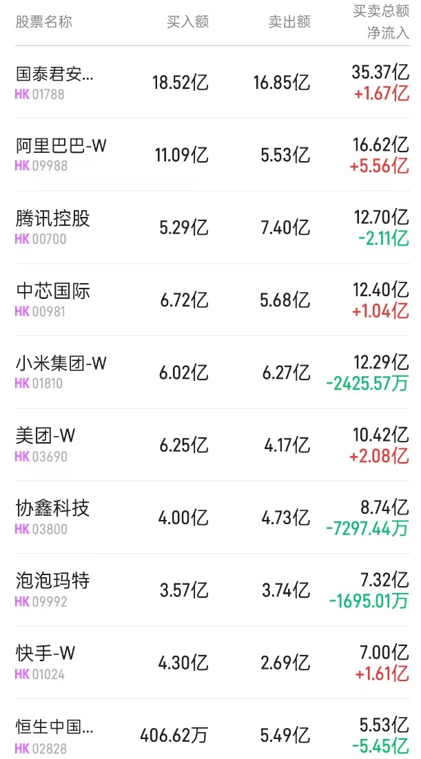 此外,中芯国际(00981)获净买入1.61亿港元,而腾讯(00700)遭净卖出6.21亿港元。
