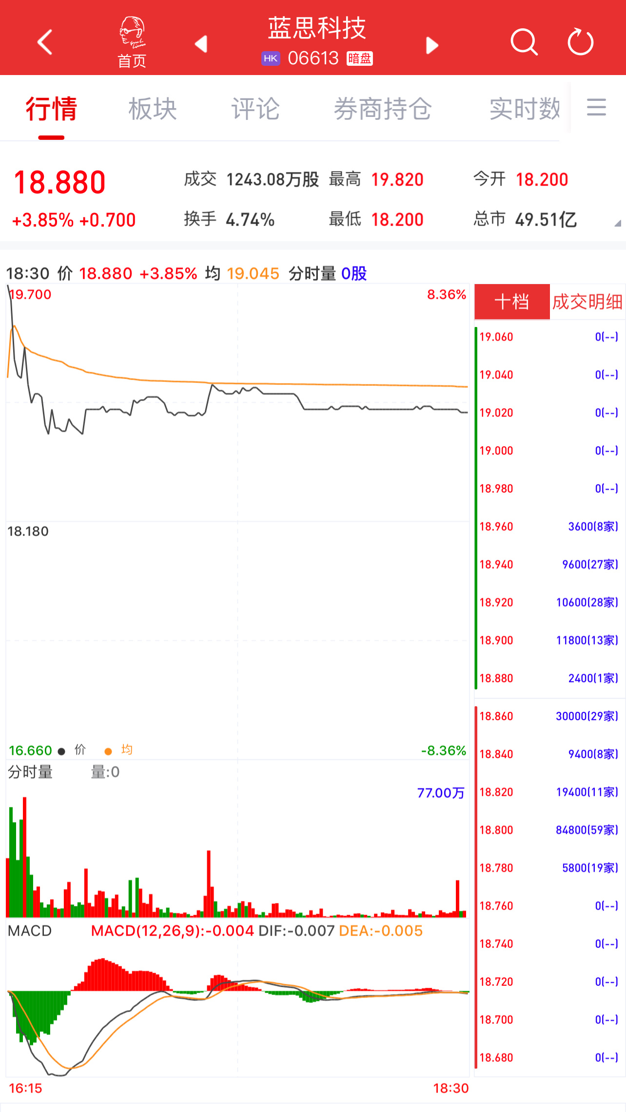 智通财经APP获悉,蓝思科技(06613)将于7月9日(周三)在香港挂牌。截至收盘,利弗莫尔证券暗盘交易显示报价18.88港元,较招股价18.18港元上涨3.85%,每手200股,不计手续费,每手赚140港元。