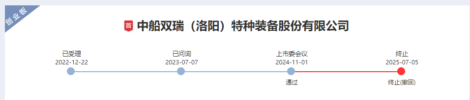 智通财经APP获悉,7月5日,中船双瑞(洛阳)特种装备股份有限公司(简称:双瑞股份)深交所创业板IPO审核状态变更为“终止(撤回)”。因双瑞股份、保荐人撤回发行上市申请,根据《深圳证券交易所股票发行上市审核规则(2024年修订)》第六十二条,深交所决定终止其发行上市审核。