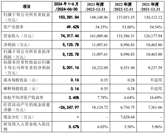 财务方面,于2021年、2022年、2023年、2024年1-6月,双瑞股份实现营业收入分别约为12.62亿元、13.36亿元、16.11亿元、7.43亿元人民币;同期,净利润分别约为1.05亿元、0.9亿元、1.11亿元、0.51亿元人民币。