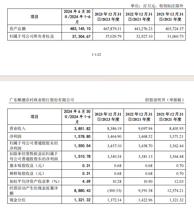 据招股书,该公司前身是始建于1952年的顺德农村信用合作社,是一家具有超过70年发展历史的金融企业,2009年12月22日改制为农村商业银行,是广东省三家首批成功改制的农村商业银行之一。截至2024年6月30日,顺德农商银行资产总额为人民币4,831.45亿元,发放贷款和垫款总额为人民币2,551.58亿元,客户存款余额为人民币3,397.74亿元,不良贷款率为1.43%,资本充足率、一级资本充足率和核心一级资本充足率分别为14.92%、12.55%和11.86%。