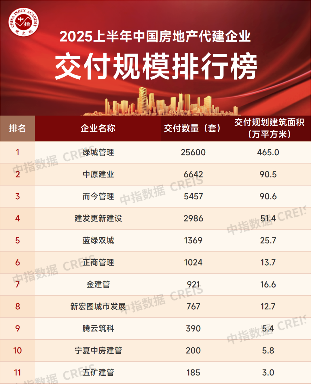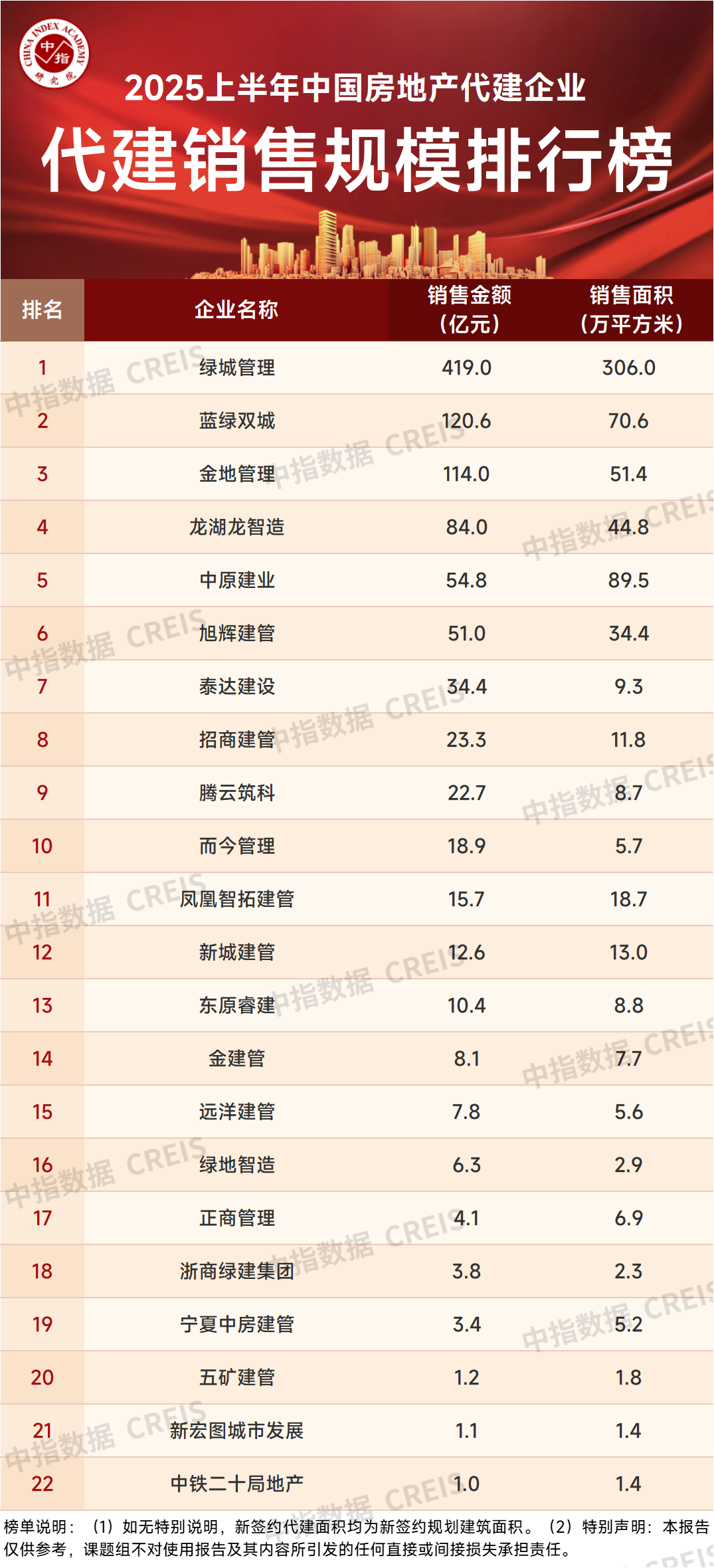 智通财经APP获悉,中指研究院发布《2025上半年中国房地产代建企业排行榜》,2025上半年,绿城管理以1989万平方米新签约规模位列第一,遥遥领先。旭辉建管和润地管理代建新签约面积分别为876万平方米和865万平方米,位列二、三位,处于领先地位。2025上半年,房地产代建企业累计规模前五门槛超800万平方米。通过对典型代建企业(2024上半年和2025上半年均在代建企业新签规模排行榜的企业)统计,2025上半年,代建新增规划建筑面积同比增长17.6%。