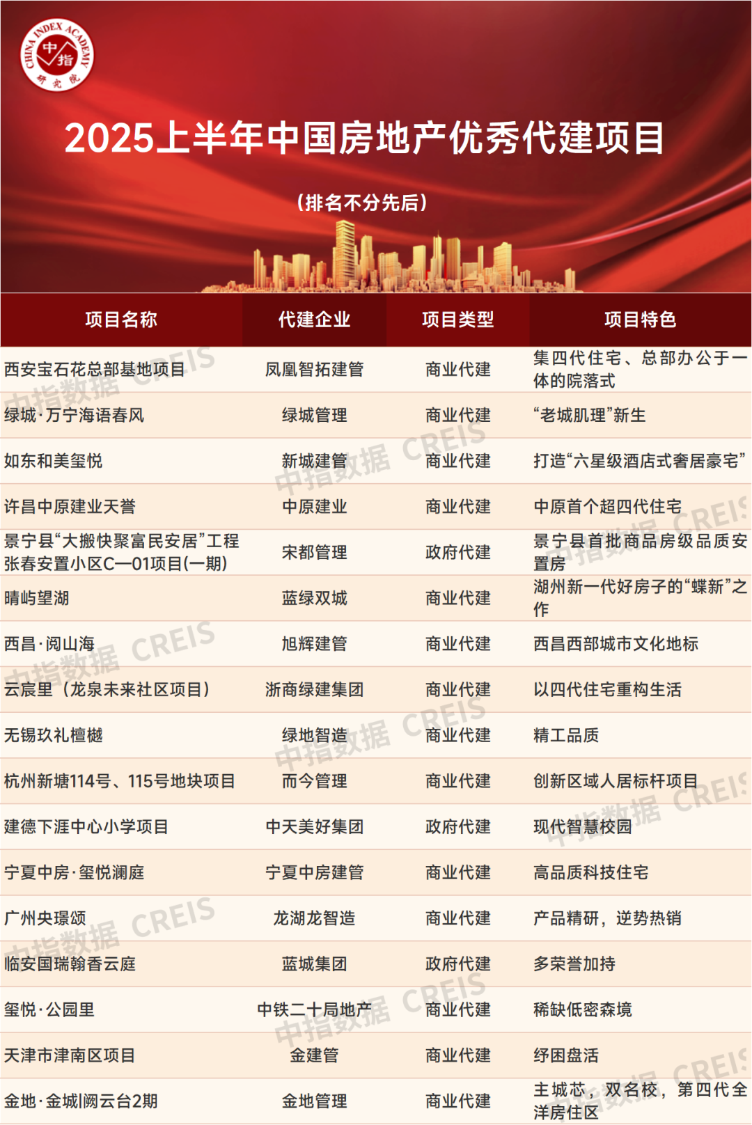 (3)以超高标准精工品质,打造区域标杆项目。新城建管代建的如东和美玺悦将酒店设计理念融入高端住宅中,不仅营造隐奢酒店式的居住体验,还实现了功能与艺术的结合。蓝绿双城代建的晴屿望湖是湖州第一个好房子项目,该项目产品空间使用率均超过100%,作为当地改善新品,项目在产品标准、社区打造等诸多方面均有亮点。绿地智造代建的无锡玖礼檀樾对标行业标杆工艺,外立面一体板工艺与室内精装瓷砖铺贴效果远超规范标准,项目荣获多个奖项。而今管理代建的杭州新塘114号、115号地块项目以“借地于城,还地予城”的设计理念,以片区规划的高度,以地换景,引水入园,在产品规划方面,真正做到顺应市场需求,打造区域的人居标杆项目。宁夏中房代建的宁夏中房·玺悦澜庭精研产品力,8大智慧安防系统安全便捷居住,是惠农首个主题园景—学府园林社区,也是惠农改善高阶作品。龙湖龙智造代建的广州央璟颂通过总图九轮推演,比选得到“总图+户型”相对最优解,通过精准项目定位、高品质产品精研,助力央璟颂首开即红盘,逆势引领行业!中铁二十局代建的玺悦・公园里匠造墅质纯洋房住区,以低密森境+纯洋房规制+国匠品质,鼎成不可复制的珍藏恒产。金建管代建的天津市津南项目为纾困项目,团队克服项目停盘多年等内外部各种困难;整合各项资源,通过系列营销动作实现项目重启,当月即实现业绩。金地管理代建的金地·金城|阙云台2期在产品策略上提出超尺度公共空间,80米超长礼序城市封面,从0公摊升级到负公摊、以南向四面宽+7米超尺度宽厅+可变四室+独立餐厨享四室获得合作方高度信任与认可。