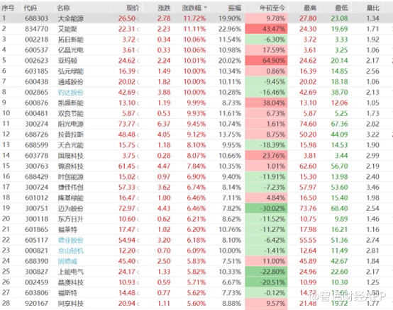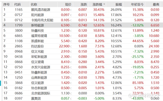 港股光伏相关个股亦纷纷大涨,从盘面来看,截至收盘时间,光伏太阳能指数涨6.17%。板块个股亦纷纷大涨,顺风清洁能源(01165)涨30.43%、阳光能源(00757)涨15.48%、卡姆丹克太阳能(00712)涨14.13%,新特能源(01799)涨12.65%。