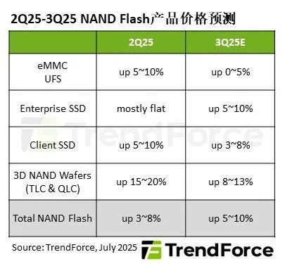 今年NVIDIA Blackwell平台出货量逐季升高,且北美地区通用型Server需求正在扩大,中国一线客户的强劲订单动能可望延续至下半年,将激励第三季Enterprise SSD需求持续成长。然而,因订单增长过快,部分供应链厂商交货未能跟上,加上原厂于年初下修产能,第三季Enterprise SSD合约价将上涨5%至10%。