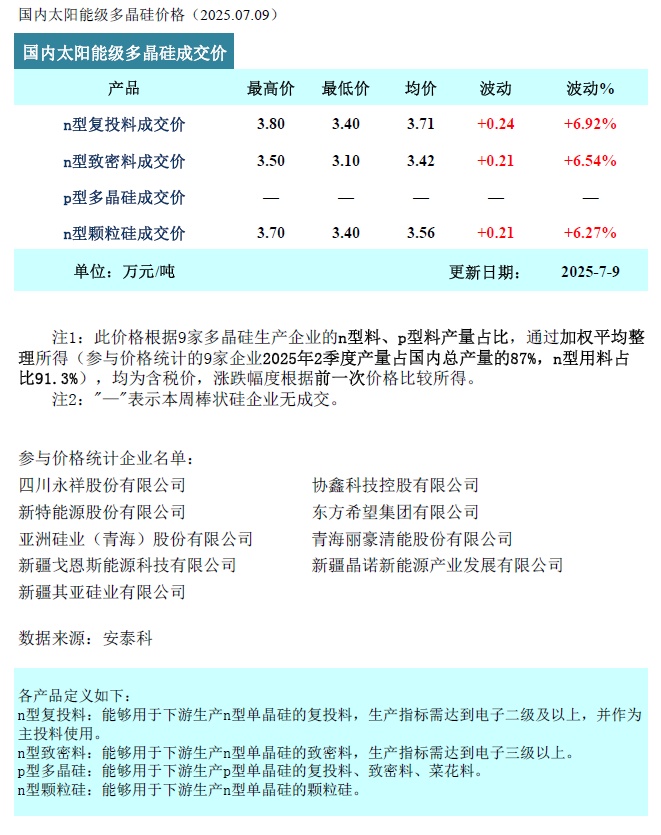 智通财经APP获悉,7月9日,硅业分会发布多晶硅周评。本周多晶硅n型复投料成交价格区间为3.40-3.80万元/吨,成交均价3.71万元/吨,环比上涨6.92%。n型颗粒硅成交价格区间为3.40-3.70万元/吨,成交均价3.56万元/吨,环比上涨6.27%。本轮多晶硅周期性调整已步入正轨,后续仍需经历深度调整与出清的关键阶段。因此预计短期内多晶硅市场仍将以观望为主,价格或将受市场预期影响有小幅抬升,待供需关系出现实质性改善,并在政策严格执行有效防止落后产能复产的前提下,多晶硅价格将逐步恢复至合理区间。