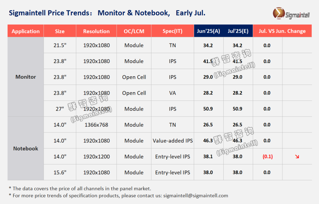 23.8"FHD,7月 Open cell & LCM面板价格环比持平;