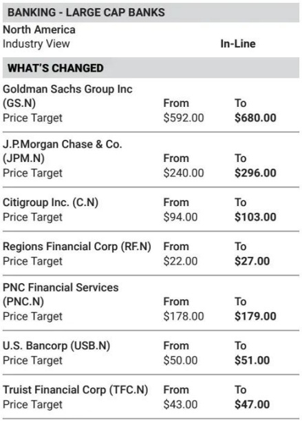智通财经APP获悉,美国最新的财报季即将拉开序幕,一般由华尔街大行财报打头阵;在下周美国各大银行公布财报之前,摩根士丹利发布研报上调了高盛(GS.US)、摩根大通(JPM.US)、花旗(C.US)、地区金融(RF.US)、PNC金融集团(PNC.US)、美国合众银行(USB.US)与Truist Financial(TFC.US)的目标价。大摩指出,资本市场已重新活跃起来,预计股票交易将十分活跃,投资银行业务收入将高于管理层的预期。由于近期的压力测试后资本要求有所降低,大摩预计管理层将开始公布股票回购计划及管理缓冲措施的相关情况。