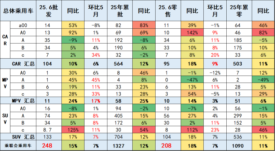 2025年6月乘用车零售增18%,大幅高于批发15%的增长。由新能源较强带来5月SUV需求占比回升,6月轿车零售与SUV零售均较强,A级SUV成为6月零售主力,SUV的高端表现较强,轿车中主要是A0级轿车销量回升,A级轿车销量表现一般。