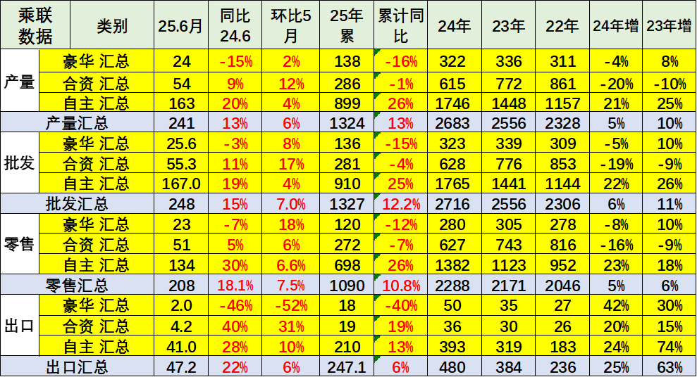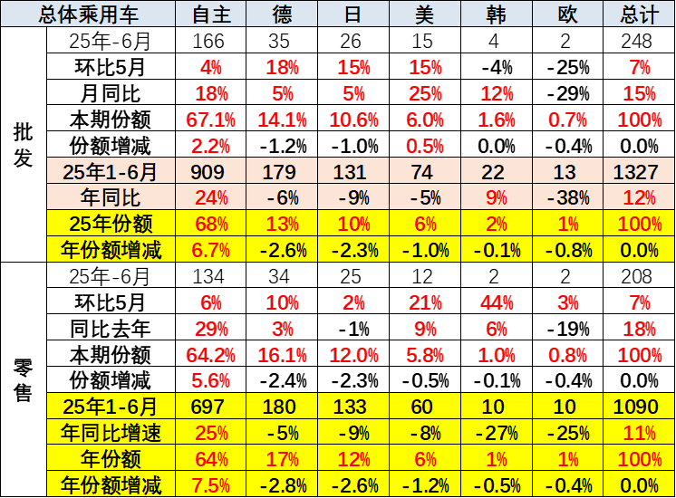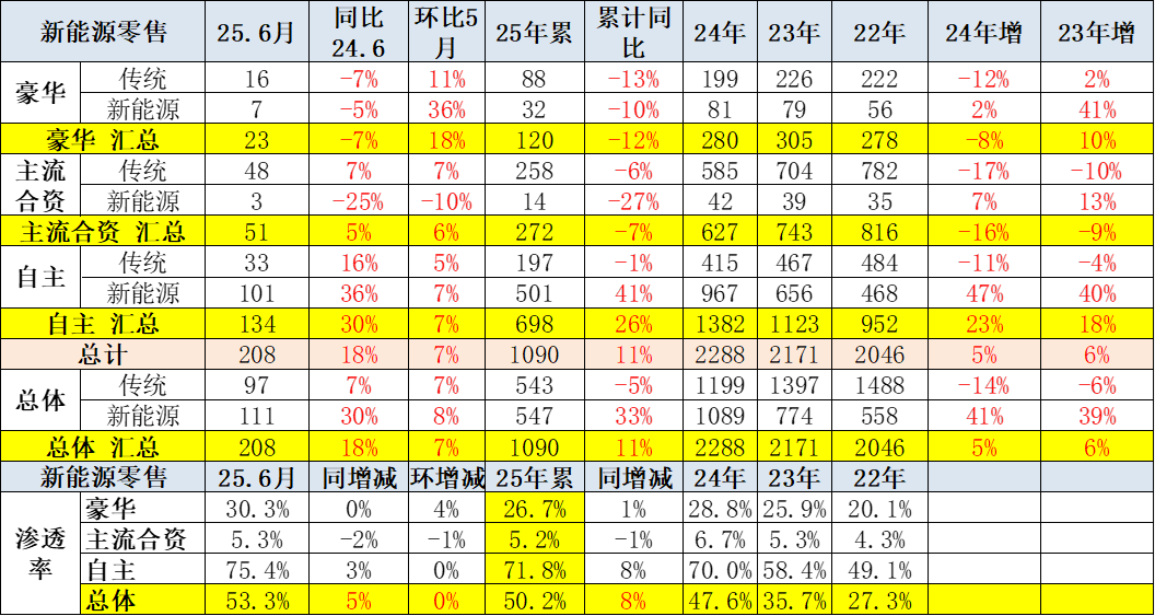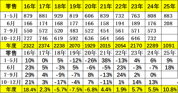2025年6月全国乘用车市场零售208万辆,同比增长18%,环比增长7.5%。今年累计零售1091万辆,同比增长11%。前几年国内车市零售呈现“前低后高”的走势,今年实现了开局良好的走势。
