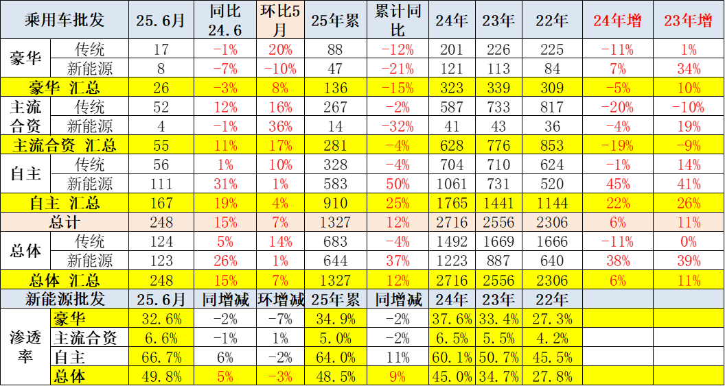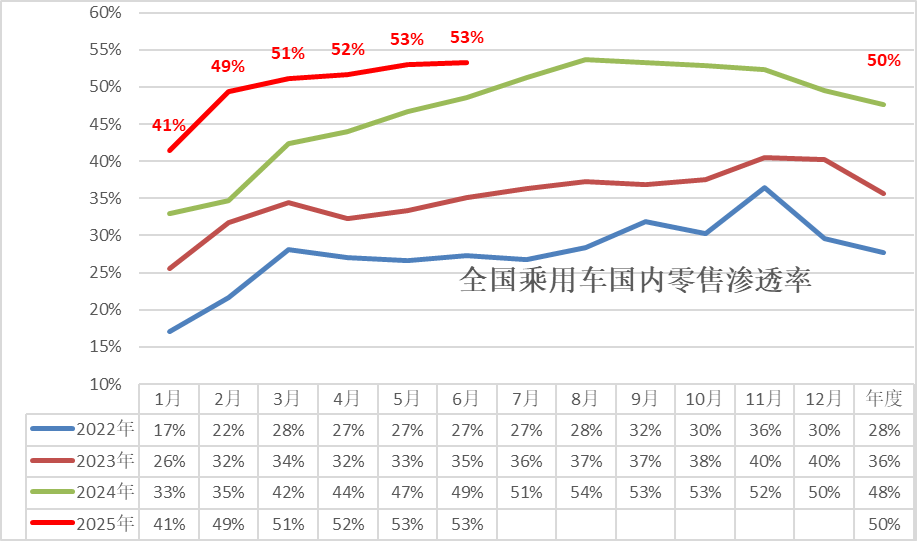 6月新能源车厂商批发渗透率50%,较2024年6月提升5个百分点。