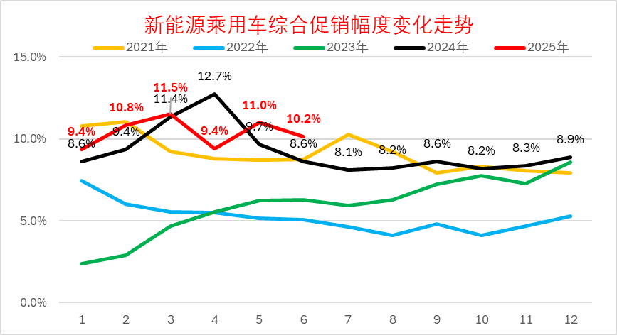 2025年6月的新能源车的促销降到10.2%的中高位,较同期增加1.6个点促销,较上月减少0.8百分点。近几个月的促销加大,随着降价的温和,促销体系优势显现,目前已达到正常促销水平的中高位。