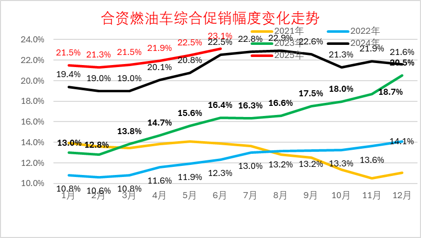 2025年6月合资燃油车的促销逐步达到23.1%的高位,较上月增加0.6个点,较同期增加0.6个百分点。合资促销剧烈增长,从2023年的13%的低位,2024年3-6月进一步大幅增长到22.5%,8月突破22.9%,随后企稳,今年6月在23.1%。