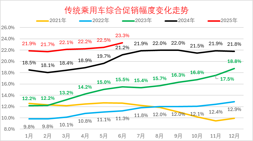2025年6月自主燃油车的促销逐步达到18.3%的高位,较同期增加2.5个百分点。自主车企在2024年3-8月的促销上升较快,随后8-12月的促销总体稳定。由于自主的新能源较强,2025年燃油车促销逐步较大,6月促销上升到18.3%。