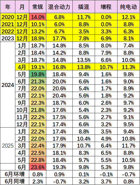 2025年初的常规燃油车和混合动力的促销压力较小,而新能源的促销相对激烈。尤其是普通混合动力促销波动较大, 6月环比上升0.9个点的促销;纯电动较上月下降0.7个点左右的促销;增程车型降价后较2024年6月增加3.7个点左右的促销。