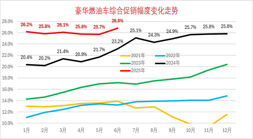 2025年6月豪华车的促销逐步达到26.8%的高位,较上月增加1.1个点,较同期增加3.6个百分点。虽然消费升级推动高端需求较强,但由于新能源的分流,2024年4-7月豪华车促销力度持续增大到25.1%,2025年1月处于历史新高水平。随着减产稳价, 2025年2-6月促销力度高位回落,6月相对稳定。