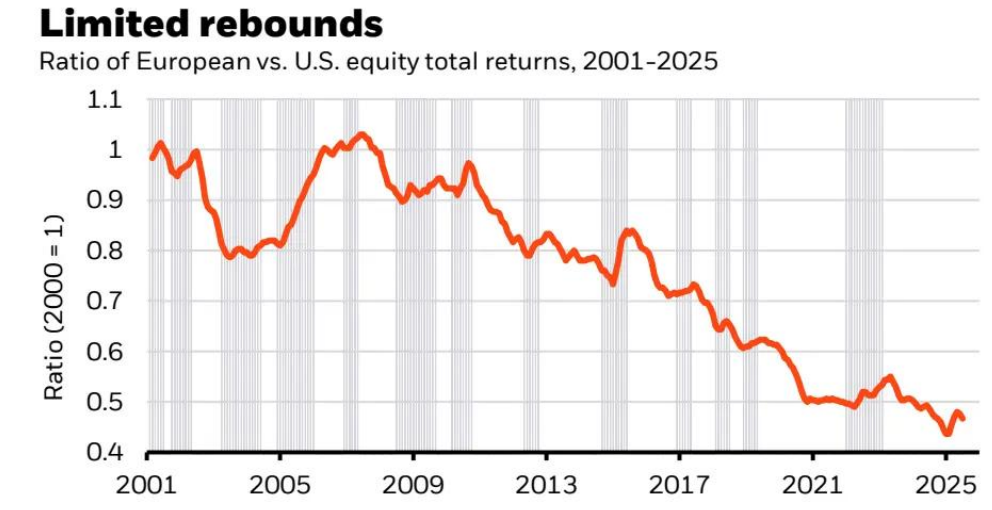贝莱德认为,当前的经济格局仍然有利于美国的表现优于其他国家。自2000年以来,欧洲股市多次跑赢美国同行,包括今年年初,但这种优势总是会消退。该行认为,欧洲需要推进结构性改革才能改变这种局面。