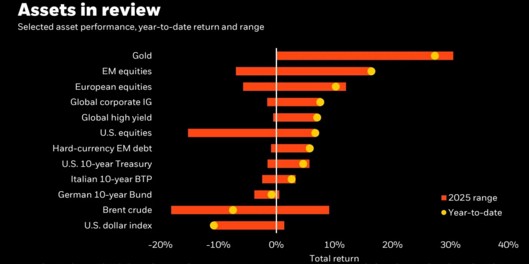 (图表标题:2025年范围年初至今黄金、新兴市场股票、欧洲股票、全球投资级公司债、全球高收益债、美国股票、新兴市场硬通货债、美国10年期国债、意大利10年期国债、德国10年期国债、布伦特原油、美元指数总回报)
