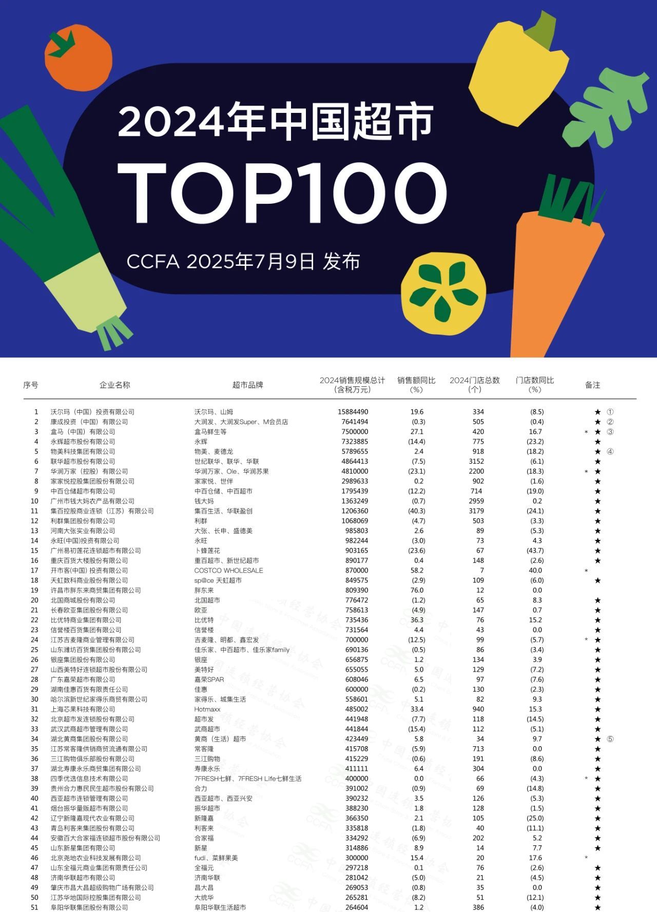 智通财经APP获悉,今日,根据2024年行业基本情况调查结果,中国连锁经营协会(CCFA)公布“2024年中国超市Top100”。2024年,超市Top100企业销售规模约为9000亿元,同比增长0.3%;门店总数2.52万个,同比下降9.8%。销售额同比增长的企业有42家,门店增加的企业有25家。销售额、门店数双增长的企业有14家。