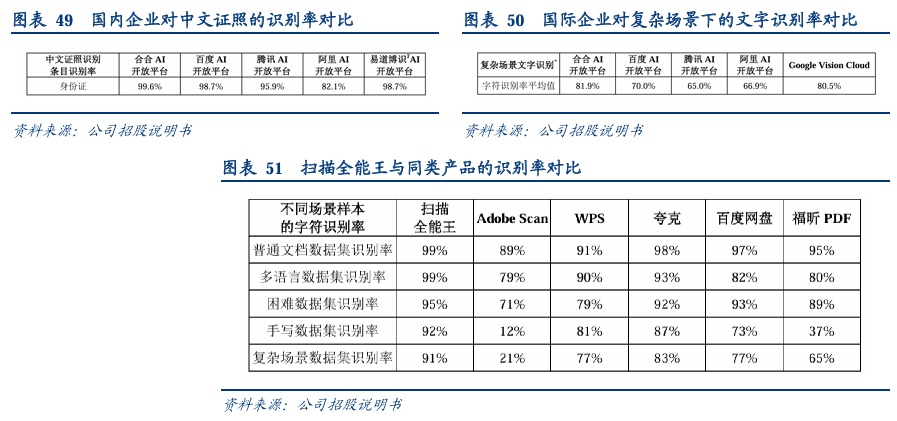 从可量化的指标看,据了解即便是在诸如多语言、多版式、多曲面等复杂场景下,合合信息的平均字符识别率都达到了81.9%,显著领先于市场同类产品。而在中文身份证识别测试中,合合AI开放平台的条目识别率达到99.6%,同样高于市场中的可比产品。不仅如此,“扫描全能王”在普通文档和多语言数据集、困难数据集、手写数据集和复杂场景数据集的识别率也都在90%以上,这同样超越了国内外一众应用。另外在智能文档处理领域,合合信息的产品也有突出表现,且还支持52种主流语言,市场综合竞争力较强。
