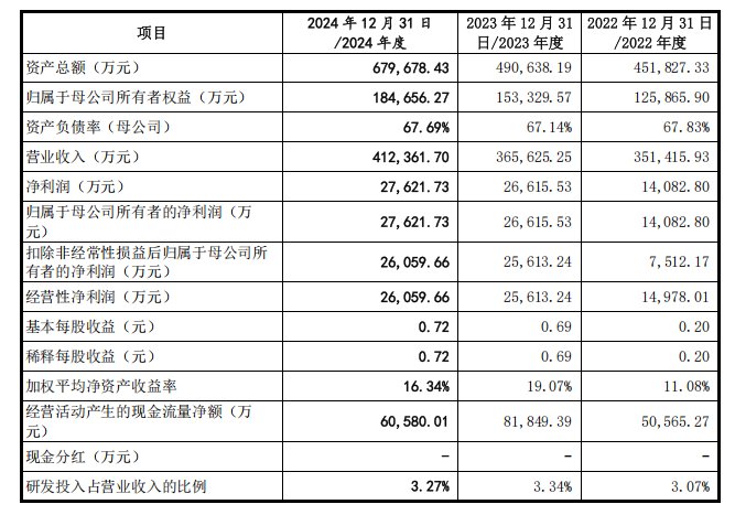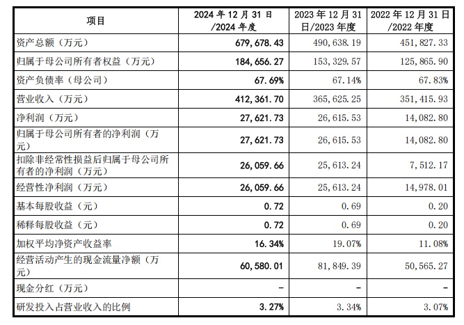 财务方面,于2022年度、2023年度及2024年度,公司营业收入分别为 35.14亿元、36.56亿元及41.24亿元,归属于母公司所有者的净利润分别为 1.41亿元、2.66亿元及 2.76亿元。