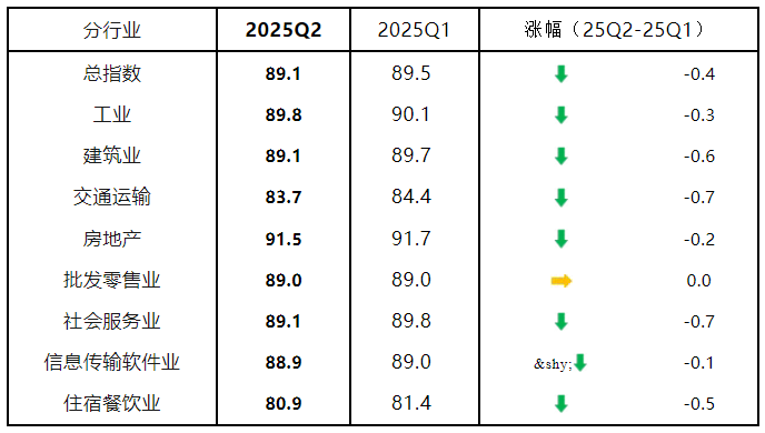 分行业指数1平7降。如下表所示,批发零售业指数与上季度持平。工业、建筑业、交通运输、房地产、社会服务业、信息传输软件业和住宿餐饮业7个行业的指数下降,分别较上季度下降0.3、0.6、0.7、0.2、0.7、0.1和0.5个点。