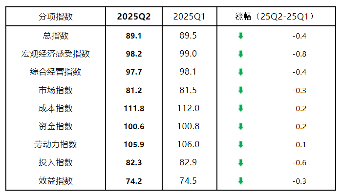 分项指数均有下降。如下表所示,宏观经济感受指数、综合经营指数、市场指数、成本指数、资金指数、劳动力指数、投入指数和效益指数8个分项指数下降,分别较上季度下降0.8、0.4、0.3、0.2、0.2、0.1、0.6、0.3个点。