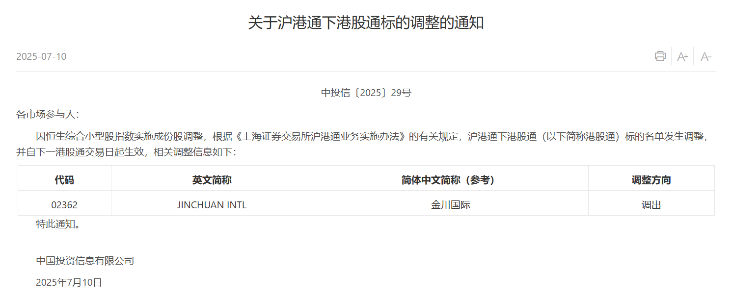 智通财经APP获悉,7月10日,中国投资信息有限公司发布公告称,因恒生综合小型股指数实施成份股调整,根据《上海证券交易所沪港通业务实施办法》的有关规定,金山国际(02362)被调出沪港通下港股通标的名单,自下一港股通交易日起生效。