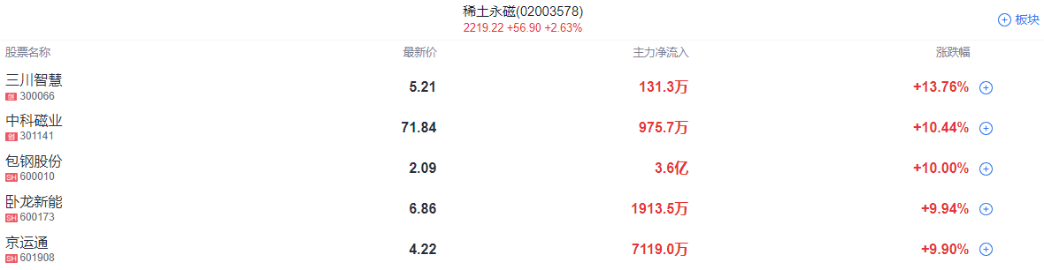 稀土概念多股走强,中科磁业涨超10%,京运通涨停,北方稀土、包钢股份等跟涨。