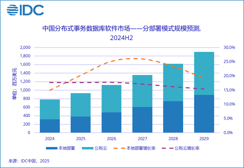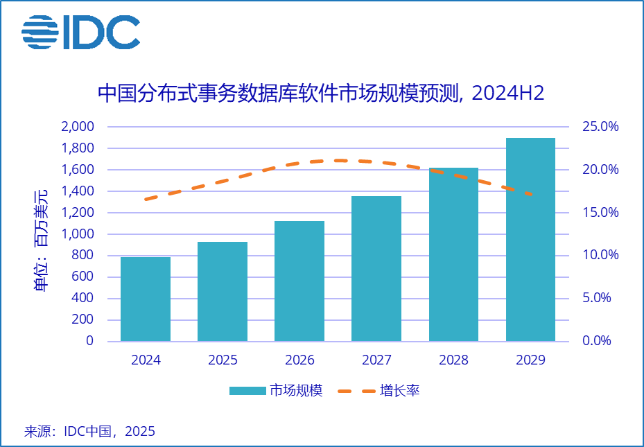 智通财经APP获悉,国际数据中心(IDC)于近日发布了《2024年下半年中国分布式事务数据库软件市场跟踪》报告。2024年,分布式事务数据库产品和技术逐步成熟,已广泛应用于泛互联网、金融、运营商等行业,产品应用已经进入规模化阶段。IDC预测,到2029年,中国分布式事务数据库市场规模将达到19.0亿美元,2024-2029的5年市场年复合增长率(CAGR)为19.4%。