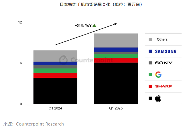 Research发布的日本智能手机销量追踪报告,2025年第一季度,日本智能手机销量同比增长31%。尽管日本智能手机市场长期被认为趋于成熟且增长停滞,但这一表现已成为近年来的显著突破。此次增长主要由Apple的强劲销量推动。2025年第一季度,Apple出货量同比增长57%,这得益于2月底发布的iPhone