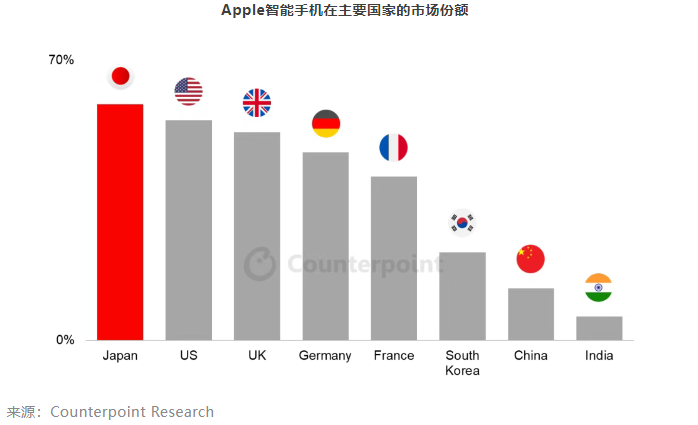 日本市场一直以Apple主导地位显著而闻名。从下图可见,Apple在日本的市场份额远高于亚洲及全球其他主要国家。
