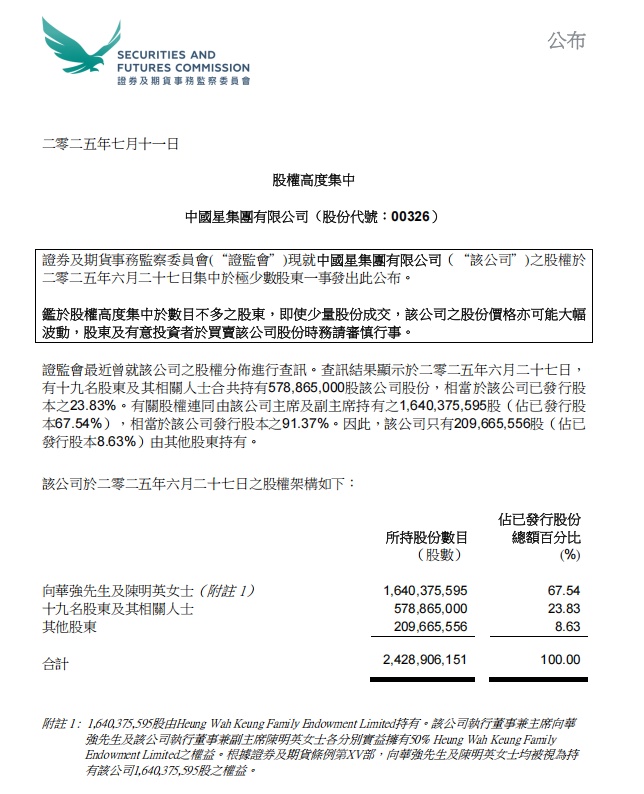 智通财经APP获悉,香港证监会最近曾就中国星集团(00326)的股权分布进行查讯。查讯结果显示,于2025年6月27日,有十九名股东及相关人士合共持有578,865,000股公司股份,相当于该公司已发行股本的23.83%。有关股权连同由该公司主席及副主席持有之1,640,375,595股(占已发行股本67.54%),相当于该公司发行股本之91.37%。因此,该公司只有209,665,556股(占已发行股本8.63%)由其他股东持有。