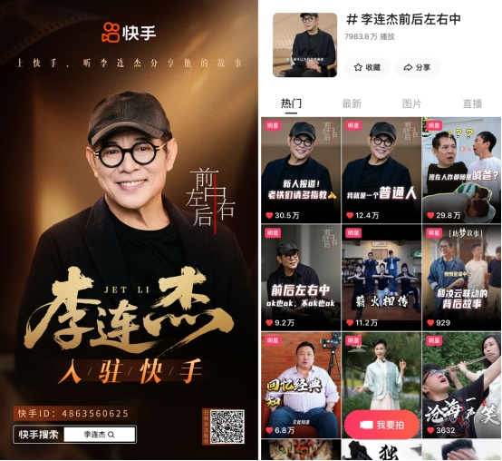 “快手的老铁们,大家好!我是李连杰。”近日,国际功夫巨星李连杰正式入驻快手,并通过短视频与粉丝探讨武术、电影、公益、生命等议题,向广大网友分享“非标准答案”的人生经验。入驻后短短两天,#李连杰前后左右中 话题播放量近8000万,其账号评论区也充满快手老铁及明星达人的温馨互动。