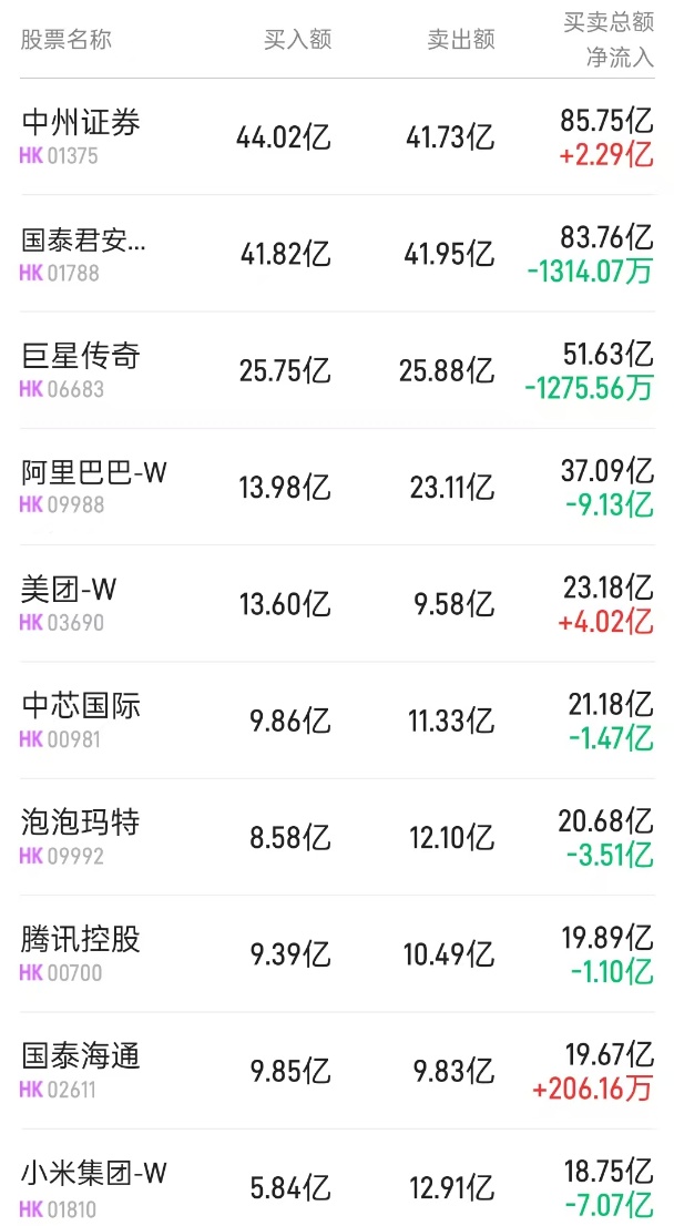 此外,中芯国际(00981)、巨星传奇(06683)分别获净买入1.03亿、205万港元。而腾讯(00700)遭净卖出1.76亿港元。