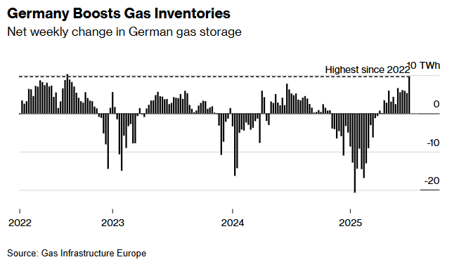 年初,人们对德国的天然气库存状况忧心忡忡。当时,交易商们担心德国政府可能不得不干预市场,从而导致价格出现大幅波动,就像欧洲能源危机期间那样。但随着以色列和伊朗同意停火,夏季天然气价格在6月底暴跌,此后一直维持在今年以来的最低水平附近,这使得补充库存的工作得以顺利进行。
