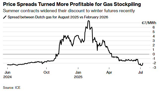一个关键的变化因素是,在近期市场低迷期间,夏季天然气价格相对于冬季合约的折扣有所扩大。截至上周,欧洲8月交货的基准天然气期货价格较2026年2月合约低约每兆瓦时2.5 欧元,创下今年以来的最大价差。