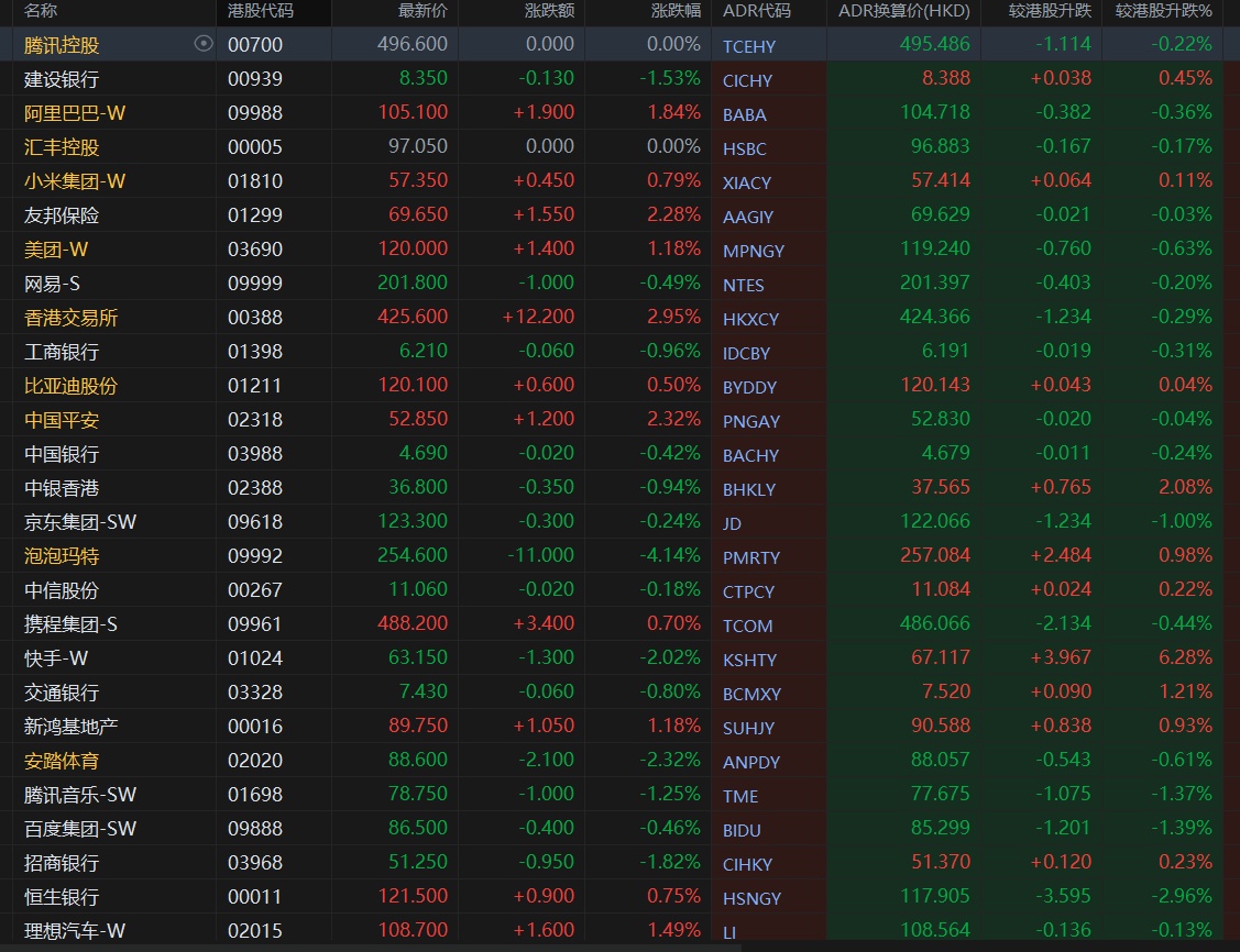 智通财经APP获悉,周五美股三大股指集体下跌,恒生指数ADR上涨,按比例计算,收报24171.98点,较香港收市升32.41点或0.13%。