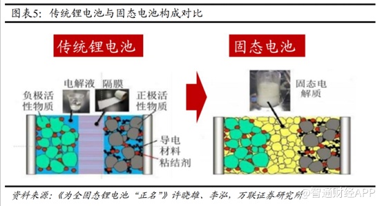 传统锂电池主要由正极材料、负极材料、隔膜和电解液四大部分组成。其中,正、负极材料决定了电池的容量,隔膜用于隔离正负极,同时允许离子通过,电解液则是连接正负极的介质,充当锂离子传输的媒介。固态电池是使用固体电解质来替代传统锂离子电池的电解液和隔膜,实现离子传输和电荷储存,是一种新型的电池技术。