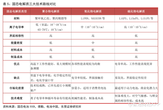 固态电池目前主要包括聚合物、氧化物、硫化物三大技术路线。目前三大技术路线各有优缺点。