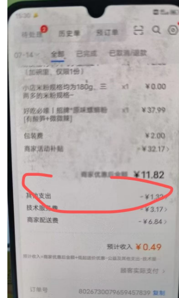 然而,老板无奈表示:“外卖不咋挣钱,平均一单就挣2块钱左右。”对于偏远订单,商家不仅要承担骑手费用,还可能亏钱。该老板展示的一笔偏远订单显示,参加活动后商家优惠金额达11.82元,减去各项支出、技术服务费和商家配送费,到手毛利仅0.49元。
