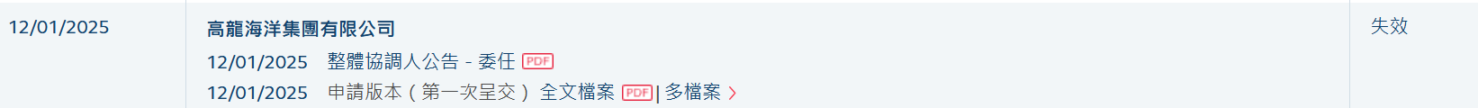 智通财经APP获悉,高龙海洋集团有限公司(以下简称:高龙海洋)于2025年1月12日所递交的港股招股书满6个月,于2025年7月12日失效,递表时越秀融资为其独家保荐人。