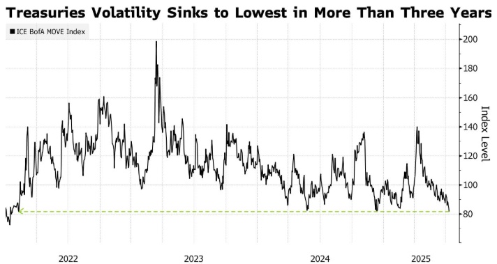 结果是,交易员们对于全球最大的债券市场未来走向缺乏信心,因此在过去一周内他们纷纷撤回了大量看涨押注。这种不确定性带来的影响使得市场目前处于区间波动状态,2年期美国国债(其收益率对美联储政策预期最为敏感)的利率在 3.7% 至 4% 之间波动,这一情况自 5 月初以来一直持续。与此同时,衡量美国国债预期波动性的指标已从因关税而达到的 4 月高位大幅回落,降至近三年来的最低水平。