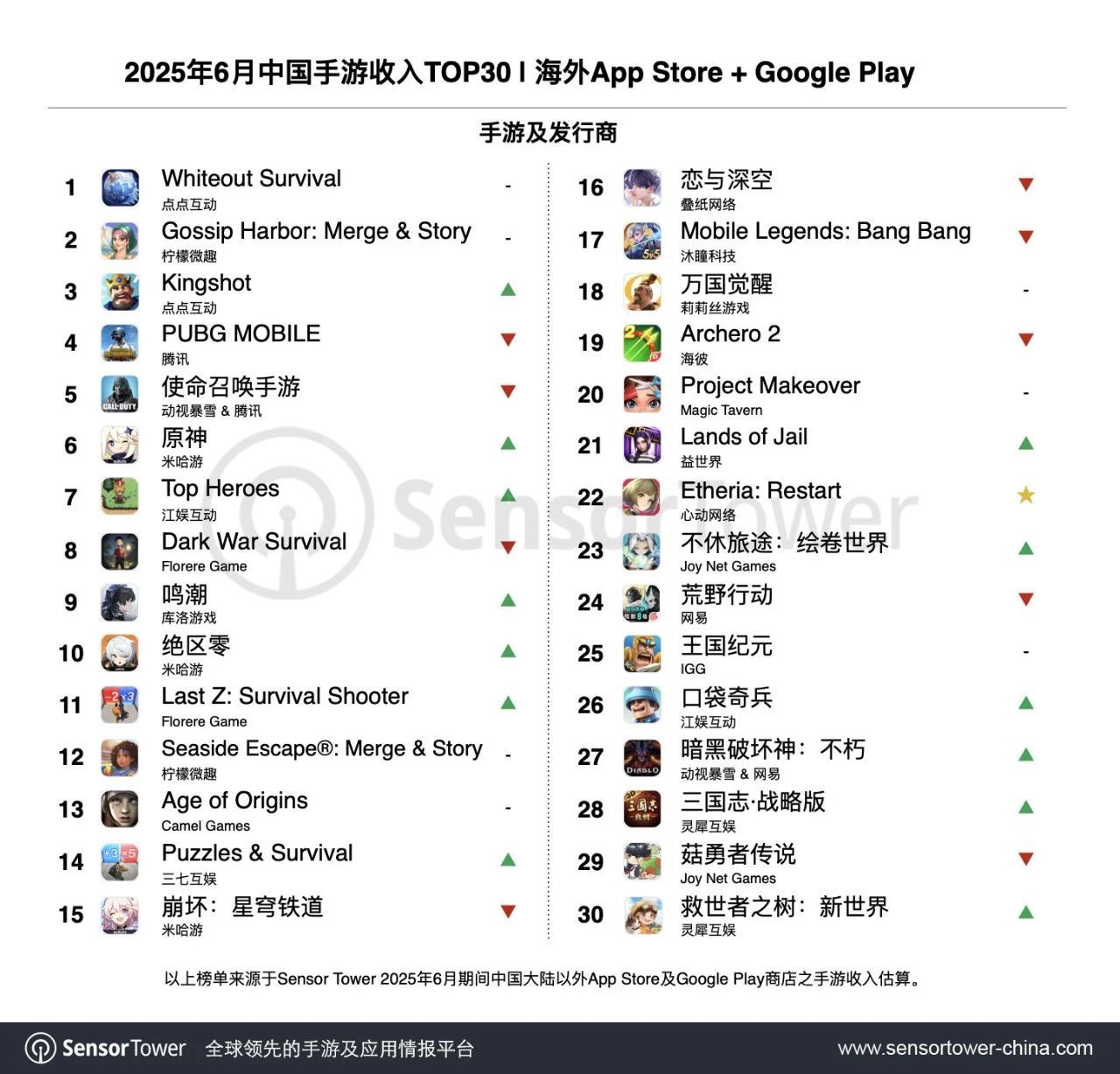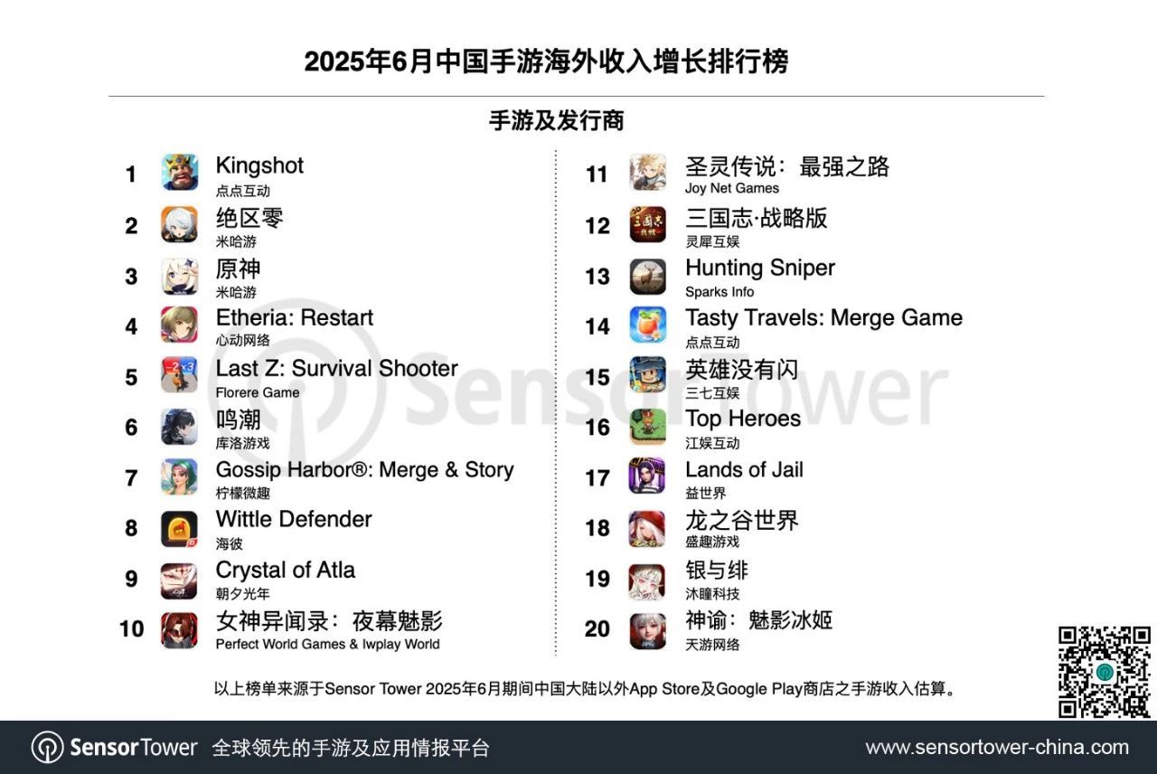 智通财经APP获悉,7月14日,Sensor Tower商店情报平台公布2025年6月中国手游产品在海外市场收入及下载量排行榜。点点互动《Whiteout
