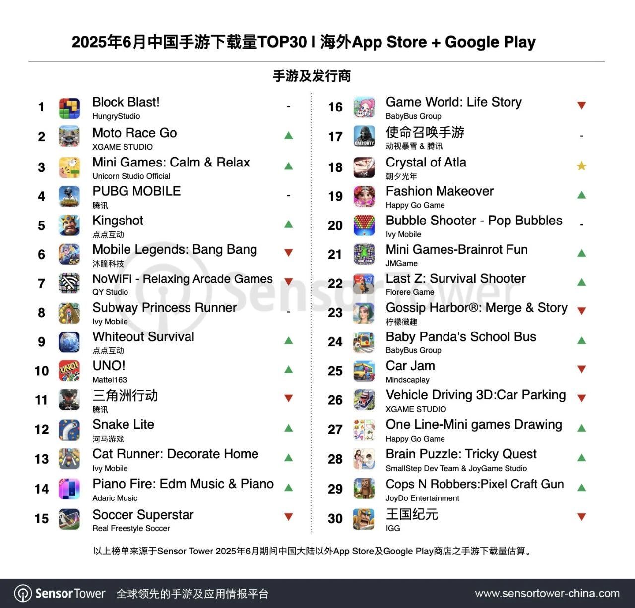 Hungry Studio消除手游《Block Blast!》继续蝉联本月出海手游下载榜和全球手游下载榜冠军,全球累计下载量接近5.3亿次。