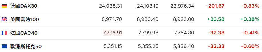 2. 截至发稿,德国DAX指数跌0.83%,英国富时100指数涨0.38%,法国CAC40指数跌0.41%,欧洲斯托克50指数跌0.60%。